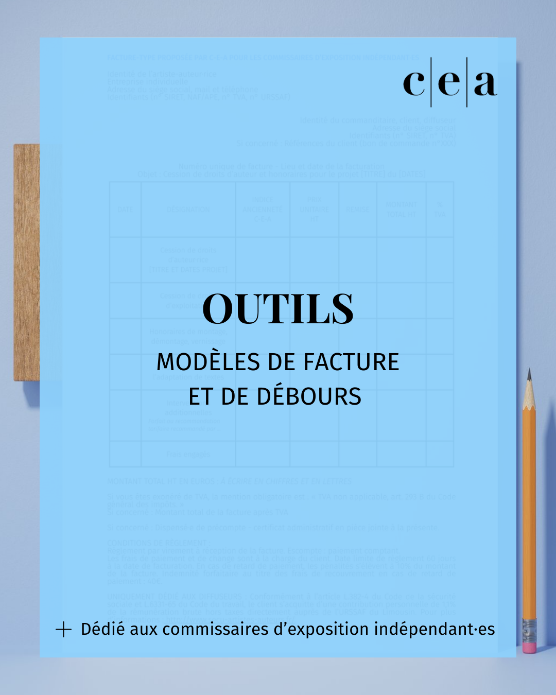Selon les situations et le contexte, C-E-A conseille d’ajouter les mentions suivantes aux factures éditées dans le cadre d’un projet curatorial :